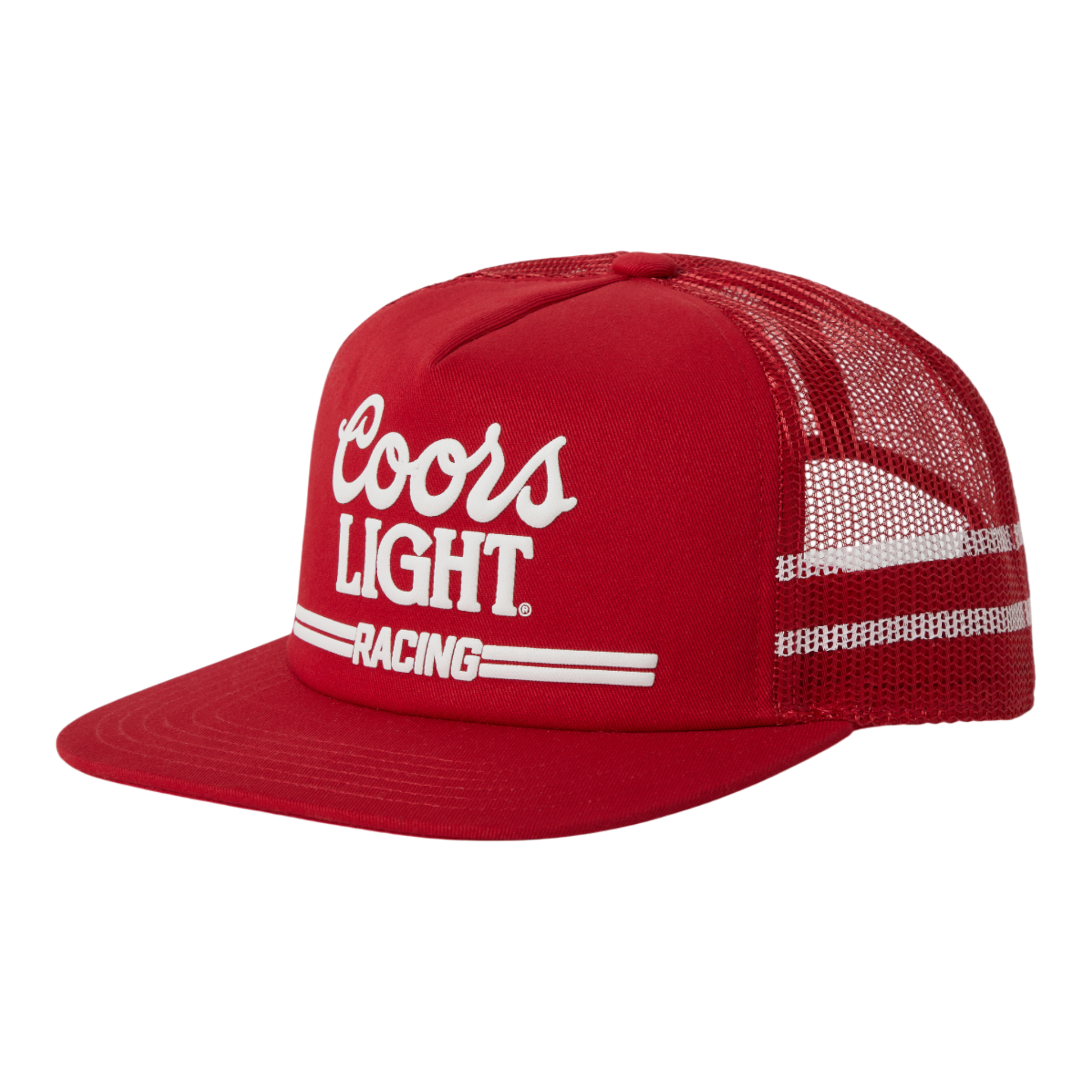 The Brixton x Coors Light Racing MP - Red features a classic trucker fit with iconic Coors branding and mesh back.