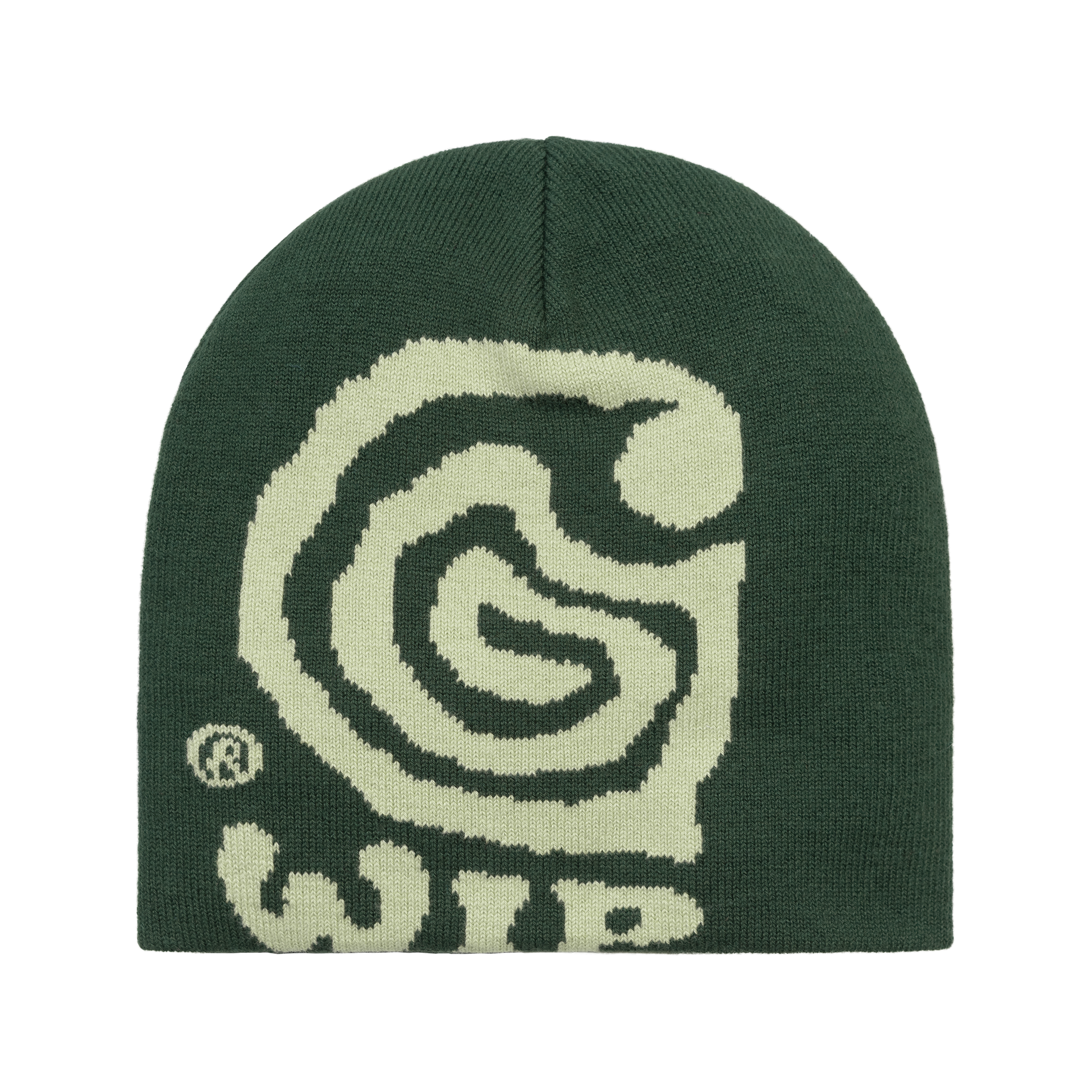 The Helix Beanie is a midweight knit made from stretch-cotton yarn. A jacquard motif appears on the side.