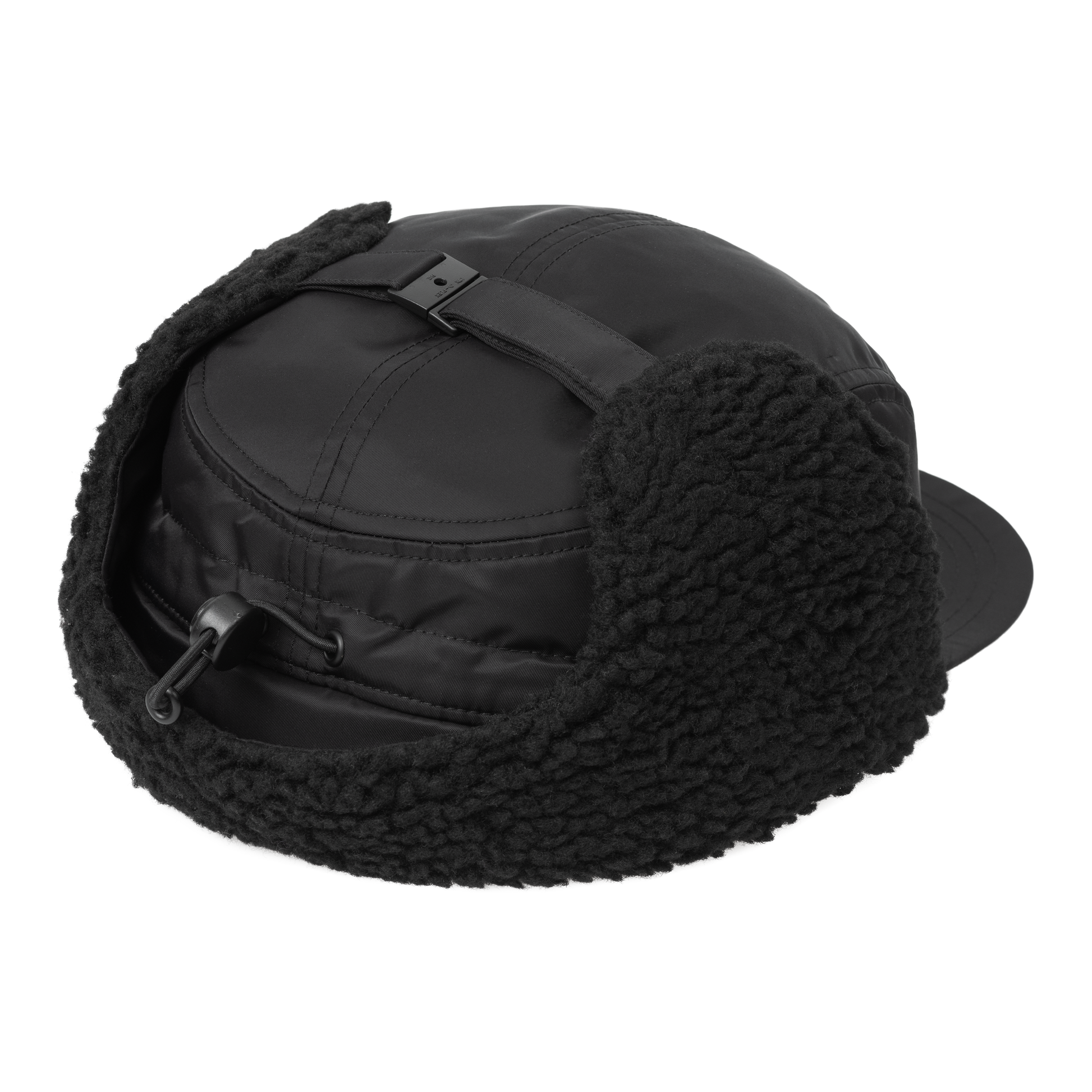 The Oltera Ear Guard Cap is an unstructured four-panel style made from midweight nylon fabric. The item features pile-lined ear guards which can be fastened at the top of the hat with a clasp. A woven Square Label appears on the front.